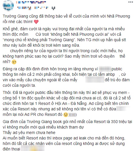 Ngoài ra, trong ngày diễn ra lễ đính hôn của “cặp đôi xứ Quảng”, toàn bộ nhân viên của resort đều không được sử dụng điện thoại, tránh rò rỉ hình ảnh ra bên ngoài.