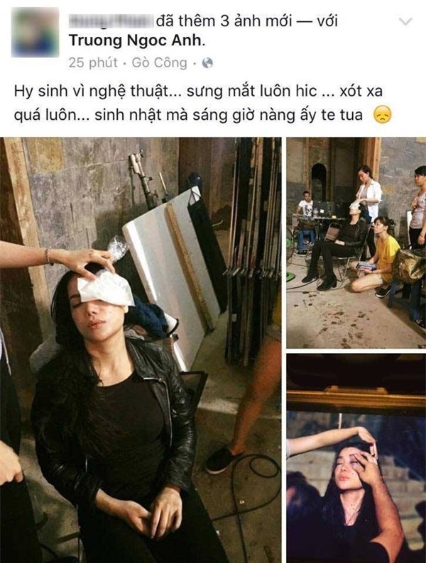 Mới đây, một người bạn thân của nữ diễn viên Trương Ngọc Ánh đã chia sẻ hình ảnh cô gặp tai nạn trên phim trường khiến mắt bị sưng húp và bầm tím. Theo một vài nguồn tin cho biết, nữ diễn viên đang trong quá trình thực hiện bộ phim hành động mới. Thông qua tấm ảnh, có thể thấy Trương Ngọc Ánh có vẻ khá mệt mỏi khi gặp phải tai nạn vào đúng ngày sinh nhật của mình (11/11).