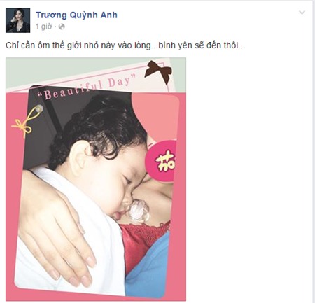 mạng. Trương Quỳnh Anh chia sẻ "Chỉ cần ôm thế giới nhỏ này vào lòng, bình yên đến thế thôi..", ngay lập đã gây sự chú ý với khán giả. Đây cũng được xem là lần phát ngôn đầu tiên của nữ ca sỹ sau khi ôm con bỏ nhà ra đi.