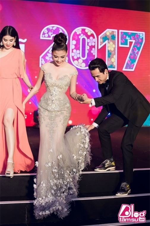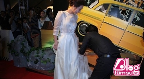Hàng trăm cặp mắt đang đổ dồn về phía mình nhưng Trường Giang không hề ngại ngùng, vẫn nâng váy cho Nhã Phương như thường