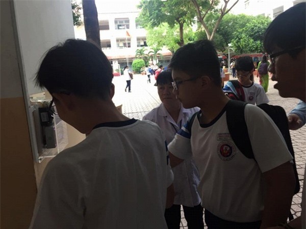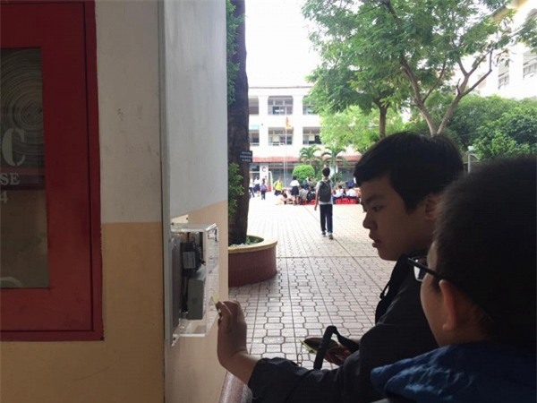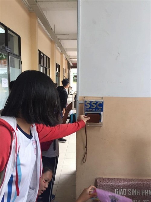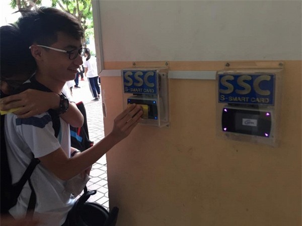 Máy chấm điểm danh được bố trí ngay cổng ra vào sân trường. |