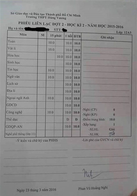 Trước đó có thông tin, mới đây bảng điểm trên phiếu liên lạc đợt 2 - học kỳ 2 của một học sinh lớp 12 Trường THPT Hùng Vương (quận 5, TPHCM) gây xôn xao trên mạng bởi 12 môn gồm Toán, Văn, Ngoại ngữ, Vật Lý, Hóa học, Sinh học, Địa lý, Giáo dục Công dân, Công Nghệ, Tin học và Giáo dục Quốc phòng-An ninh đều được 10 điểm ở cột 15 phút và kiểm tra 1 tiết. Do đó, cột điểm trung bình cũng toàn điểm 10. Riêng môn Thể dục được điểm Đạt (môn này chỉ có hai lựa chọn là Đạt và Không đạt).