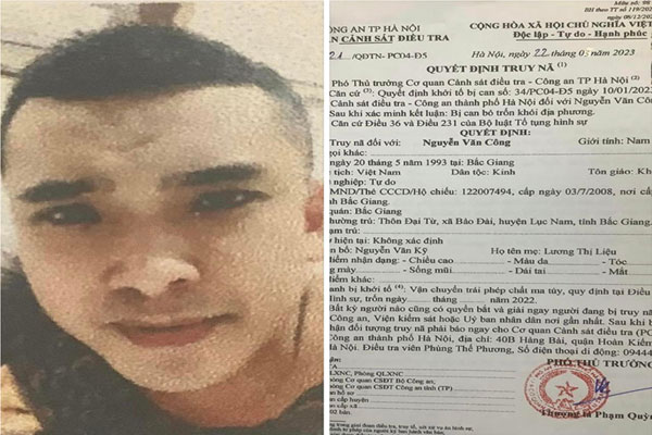Ngày 2/5, Cơ quan Cảnh sát điều tra Công an TP Hà Nội thông tin đã ra Quyết định truy nã đối với Nguyễn Văn Công (SN 1993, trú huyện Lục Nam, tỉnh Bắc Giang) về tội "Vận chuyển trái phép chất ma túy".