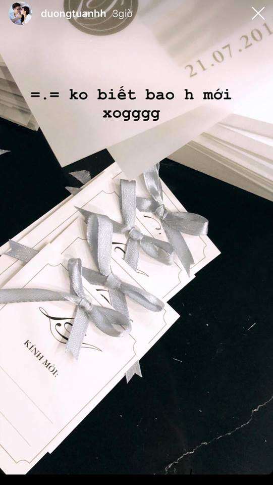 Thông tin Á hậu Tú Anh sẽ tổ chức đám cưới vào 21/7 tới đây khiến người hâm mộ chờ đón. Hứa hẹn, ngày trọng đại của người đẹp sẽ có sự góp mặt của dàn mỹ nhân, nghệ sĩ nổi tiếng showbiz. Những ngày này, Tú Anh cũng đang tất bật chuẩn bị cho hôn lễ, cô nàng vừa chia sẻ hình ảnh thiệp cưới trên trang instagram.