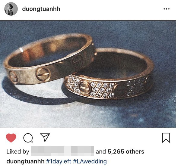 Chỉ còn đúng 1 ngày nữa, đám cưới của Á hậu Tú Anh và ông xã thiếu gia chính thức diễn ra tại Hà Nội. Người đẹp liên tục đăng tải hình ảnh đếm ngược thể hiện tâm trạng hồi hộp trước giờ giờ cử hành hôn lễ. Sau loạt ảnh cưới lãng mạn chẳng kém phim Hàn, người đẹp vừa khoe bức ảnh nắm tay vị hôn phu của mình để lộ nhẫn cưới được chế tác tinh xảo và có gắn nhiều viên kim cương lấp lánh. Cặp nhẫn này của một thương hiệu cao cấp, nổi tiếng có tổng giá trị 200 triệu đồng, trong đó nhẫn cô dâu có giá 6.650 USD (154 triệu đồng), nhẫn chú rể 2.020 USD (46 triệu đồng).
