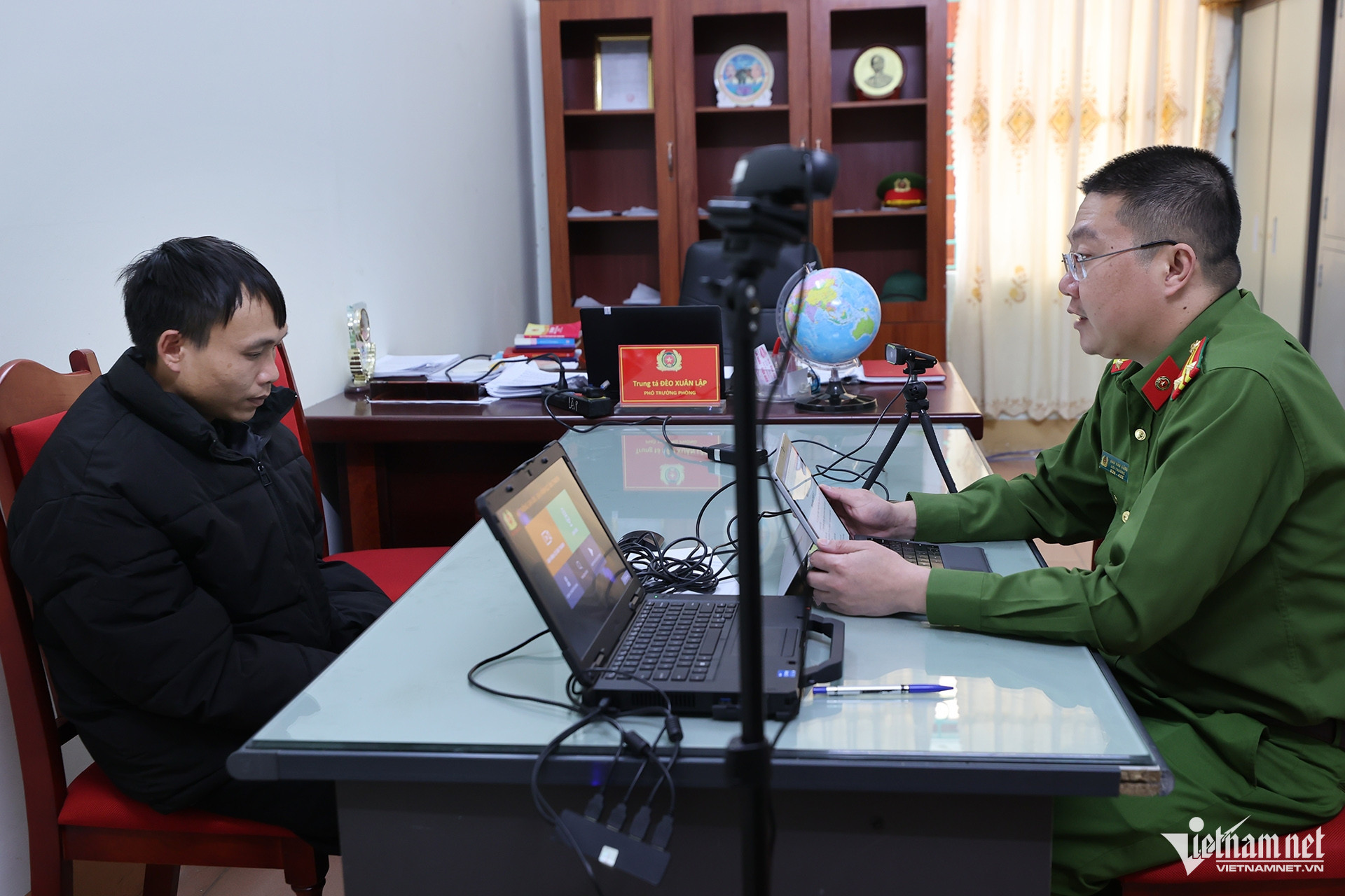 Điều tra viên lấy lời khai đối tượng tàng trữ, sử dụng vũ khí quân dụng liên quan chuyên án 0126K. Ảnh: Lê Anh Dũng