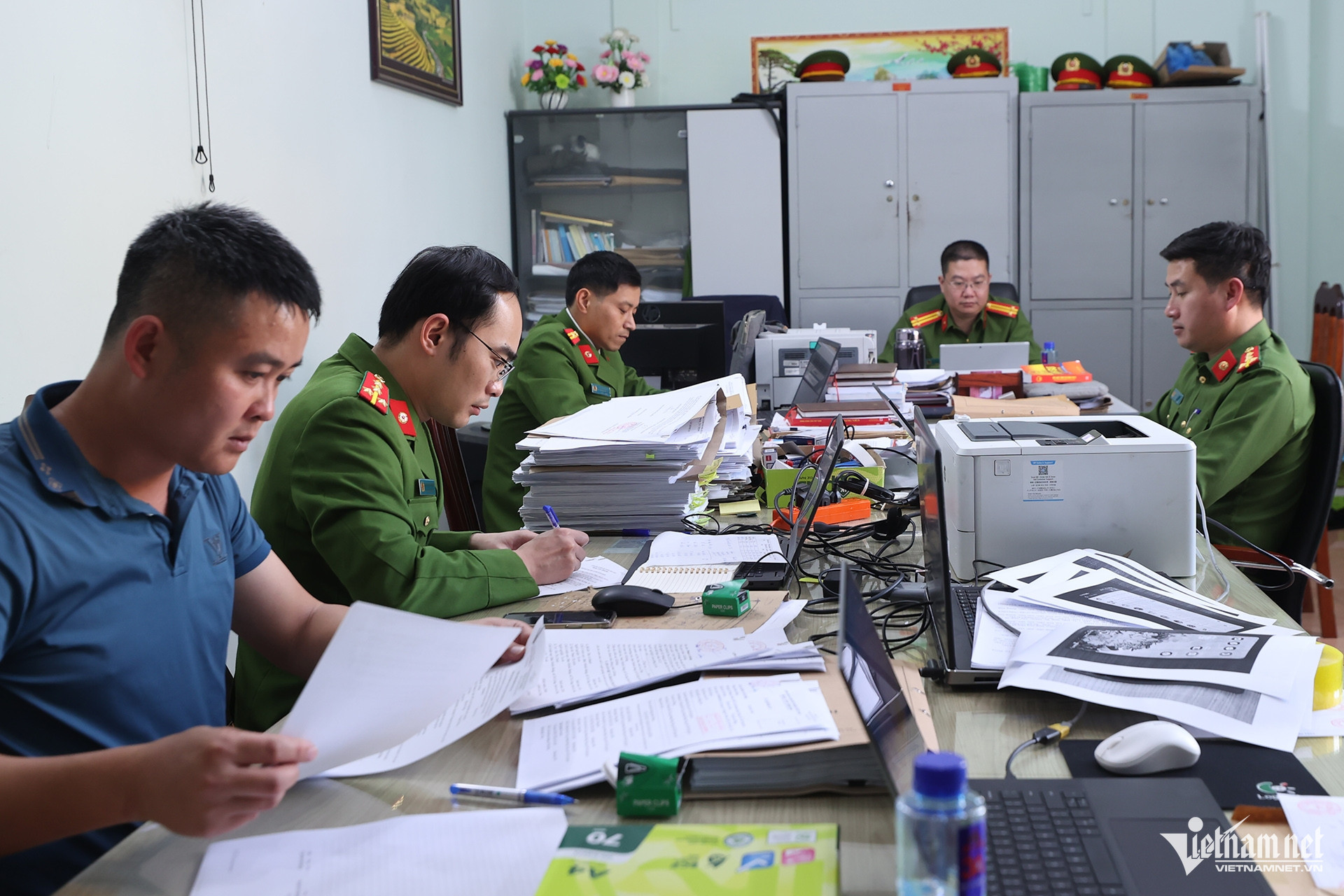 Các điều tra viên thuộc Phòng CSHS Công an tỉnh Lai Châu đang khẩn trương hoàn thiện hồ sơ, xử lý các đối tượng tàng trữ, sử dụng vũ khí quân dụng. Ảnh: Lê Anh Dũng
