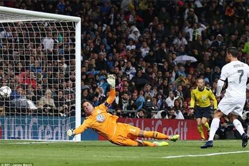 Một pha căng ngang có vẻ không như ý muốn của Daniel Carvajal bỗng trở thành đường chuyền đẹp mắt. Ronaldo xuất hiện nhanh như chớp đệm bóng cận thành ghi bàn mở tỷ số cho Real sau 16 phút đầu tiên. Sau đó vỏn vẹn 1 phút, Bernabeu như vỡ òa với cú đúp bàn thắng của siêu sao người Bồ Đào Nha, lần này xuất phát từ cú đánh đầu.