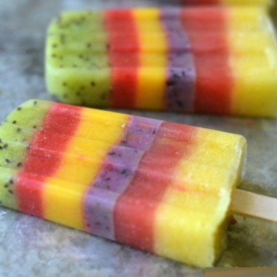 Bước 5: Cuối cùng bạn mới tạo lớp màu tím thì bạn sử dụng việt quất nhé. Bạn rửa sạch việt quất rồi cho vào máy xay nhuyễn, rồi cho lớp nho màu tím này lên trên 4 lớp ban đầu nhé. Bạn không quên đậy nắp lại và cho vào trong tủ lạnh vài giờ để cho tất cả các lớp trong khuôn kem đông cứng hoàn toàn.
