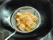 Dùng đũa nhẹ nhàng lật khoai, chiên cho đến khi vàng hết bề mặt thì vớt ra, đặt trên đĩa có giấy thấm dầu.