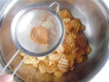 Khi khoai đã khô, dùng rây rây bột chiên giòn vào, đồng thời đảo khoai để bột dính đều lên khoai mà không vón cục.