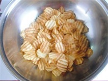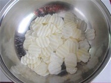 Khoai tây rửa sạch, nạo vỏ, dùng dụng cụ chuyên dụng cắt thành từng lát mỏng có hình lượn sóng.