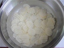 Khoai tây đã thái lát cho vào nước sạch ngâm muối cho bớt thâm. Sau đó rửa sạch với nước lạnh.
