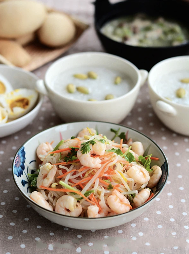 1. Giá đỗ trộn tôm Tôm, giá đỗ, cà rốt, bột bắp, hạt tiêu, muối, giấm trắng, đường, rau mùi