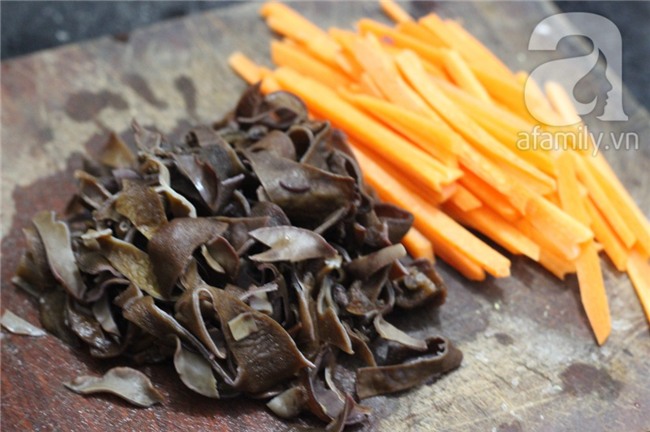 Mộc nhĩ ngâm cho nở, sau đó rửa sạch rồi thái sợi. Cà rốt thái sợi nhỏ.