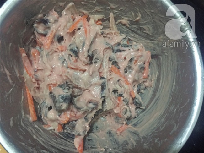 Trong một tô sạch, cho cà rốt, mộc nhĩ, giò sống, tai heo thêm chút gia vị hạt nêm vào trộn đều.