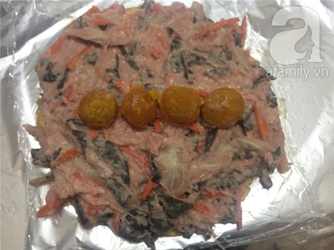 Nếu có lá chuối thì trải 1 lớp lá chuối lên mặt phẳng, nếu không dùng giấy bạc cũng được. Sau đó trải phần trứng tráng lên trên. Tiếp theo dàn đều phần giò thập cẩm lên mặt trứng, rồi xếp trứng muối đã chín lên. Nhẹ nhàng cuộn lại sao cho phần giò tròn trịa.