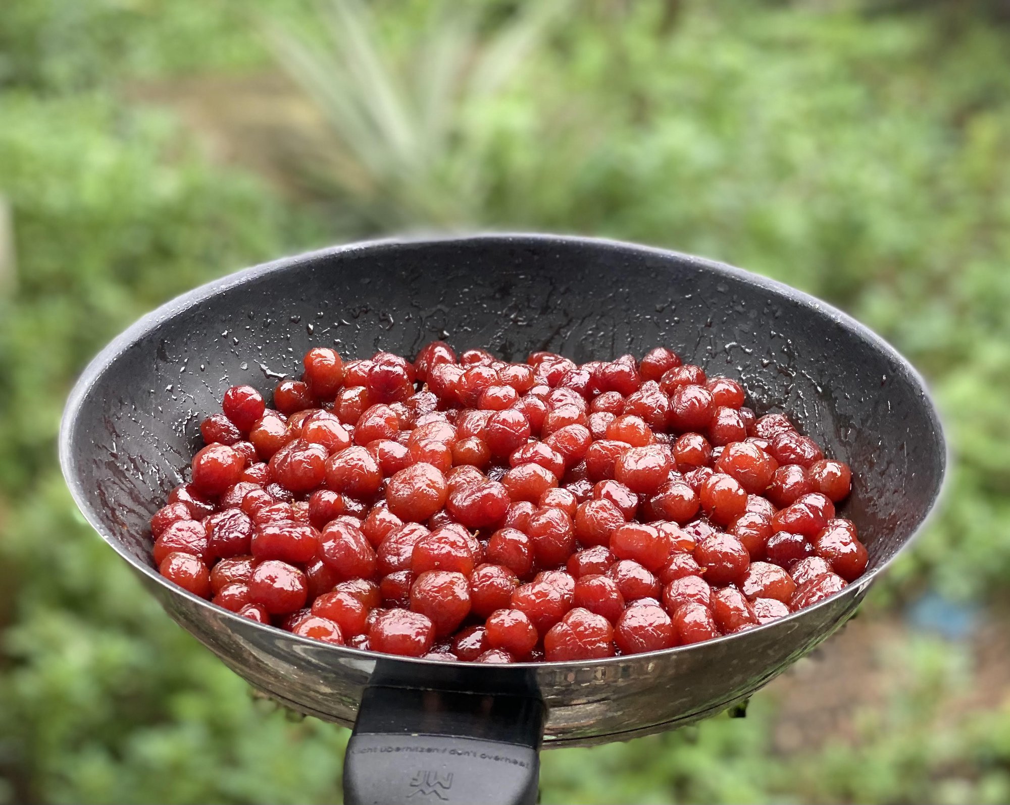 Rim cho đến khi chùm ruột chuyển màu đỏ. Lưu ý độ chua của chùm ruột quyết định màu có đỏ hay không chứ không cần sử dụng màu thực phẩm.