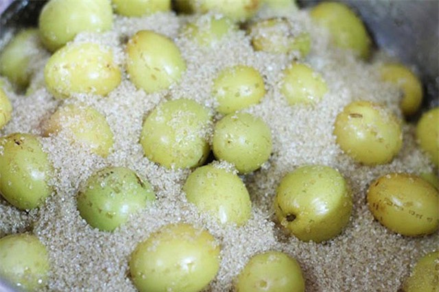 - Bước 3: Đổ táo vào chậu nước rửa lại nhiều lần cho hết mùi vôi, sau đó để ráo rồi ướp táo với đường khoảng 12h cho tan hết đường (lúc này táo thâm 1 chút cũng không sao nhé).
