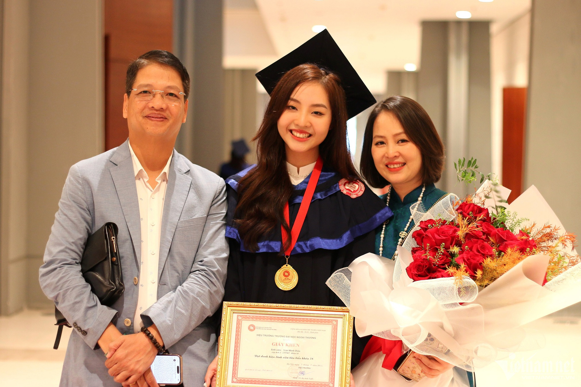 Bố mẹ chúc mừng Minh Châu trong buổi lễ nhận bằng tốt nghiệp loại Giỏi của Trường ĐH Ngoại thương. Ảnh: Thanh Hùng