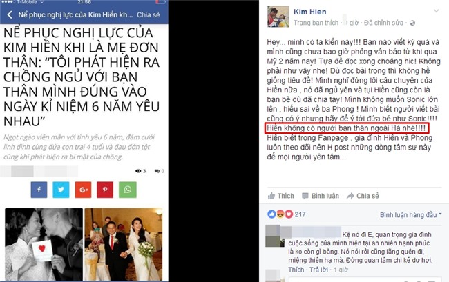 Cuối cùng, Kim Hiền khẳng định mình "không có người bạn thân nào ngoài Hà (Tăng Thanh Hà)". Đồng thời, nữ diễn viên cũng gửi lời nhắn nhủ tới gia đình người thân và chồng cũ: "Hiền biết gia đình Hiền và Phong luôn theo dõi nên Hiền post những dòng tâm sự này để mọi người yên tâm".
