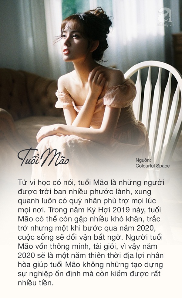 Trong năm Kỷ Hợi 2019 này, tuổi Mão có thể còn gặp nhiều khó khăn, trắc trở nhưng một khi bước qua năm 2020, cuộc sống sẽ đổi vận bất ngờ. Người tuổi Mão vốn thông minh, tài giỏi, vì vậy năm 2020 sẽ là một năm thiên thời địa lợi nhân hòa giúp tuổi Mão không những tạo dựng sự nghiệp ổn định mà còn kiếm được rất nhiều tiền. Ngày trước khó khăn thế nào không biết nhưng từ giai đoạn này, họ sẽ cảm nhận được cuộc sống mình đang thay đổi, mọi khó khăn đều được giải quyết êm đẹp, những ngày tháng sau sống yên bình mỹ mãn.