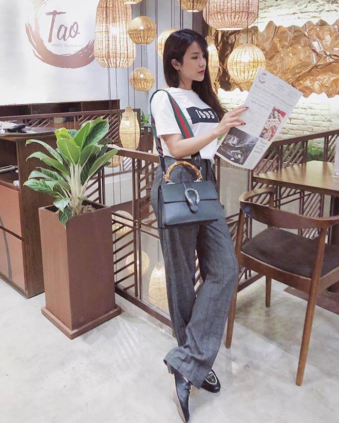Bộ trang phục phối giữa quần ống suông và áo phông trông đơn giản là vậy nhưng có thêm em Dionysus đến từ nhà Gucci có giá hơn $2000 lại khó có ai vượt mặt được độ sang chảnh.