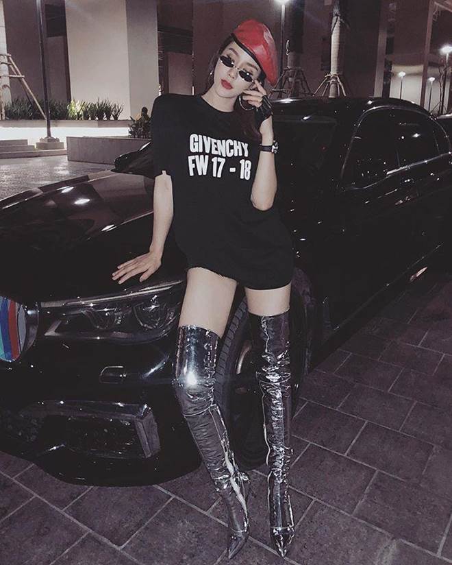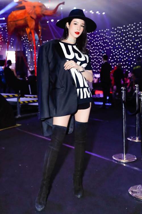 Tại một sự kiện mới đây nhất, người đẹp khoe vẻ ngoài lôi cuốn, sang chảnh khi khoác lên mình cây đồ được chắp vá từ các items hàng hiệu: áo Moschino, boots của Stuart Weitzman, đồng hồ Harry Winston và khoác ngoài của Dsquared2. Ước tính tổng thiệt hại của bộ cánh này lên đến vài trăm triệu đồng