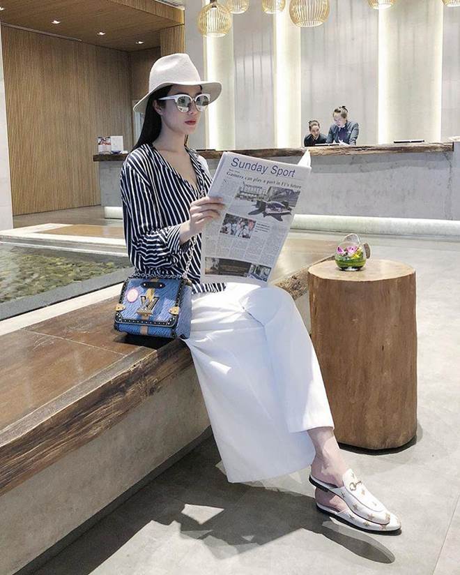 Mẫu túi Twist của LV đắt đỏ có giá trị $3850 trở thành điểm nhấn thời trang cho set đồ gồm áo kẻ sọc và quần suông trắng. Ngoài ra, giày loafer Gucci cũng mang đến cho người đẹp vẻ ngoài thanh đầy đẳng cấp.