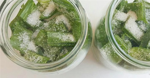 - Cắt bỏ viền gai 2 bên nhánh nha đam, thái thành khúc nhỏ chừng 2-3cm, cho vào lọ thủy tinh, thêm đường, muối và đổ ngập giấm lên nha đam để chúng lên men.