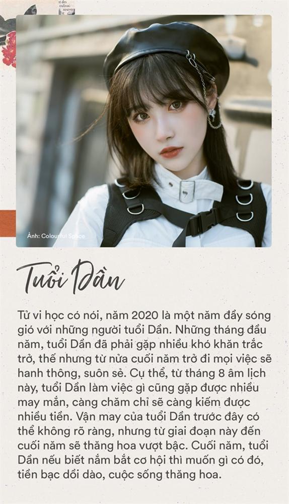 Tử vi học có nói, năm 2020 là một năm đầy sóng gió với những người tuổi Dần. Những tháng đầu năm, tuổi Dần đã phải gặp nhiều khó khăn trắc trở, thế nhưng từ nửa cuối năm trở đi mọi việc sẽ hanh thông, suôn sẻ. Cụ thể, từ tháng 8 âm lịch này, tuổi Dần làm việc gì cũng gặp được nhiều may mắn, càng chăm chỉ sẽ càng kiếm được nhiều tiền. Vận may của tuổi Dần trước đây có thể không rõ ràng, nhưng từ giai đoạn này đến cuối năm sẽ thăng hoa vượt bậc. Cuối năm, tuổi Dần nếu biết nắm bắt cơ hội thì muốn gì có đó, tiền bạc dồi dào, cuộc sống thăng hoa.