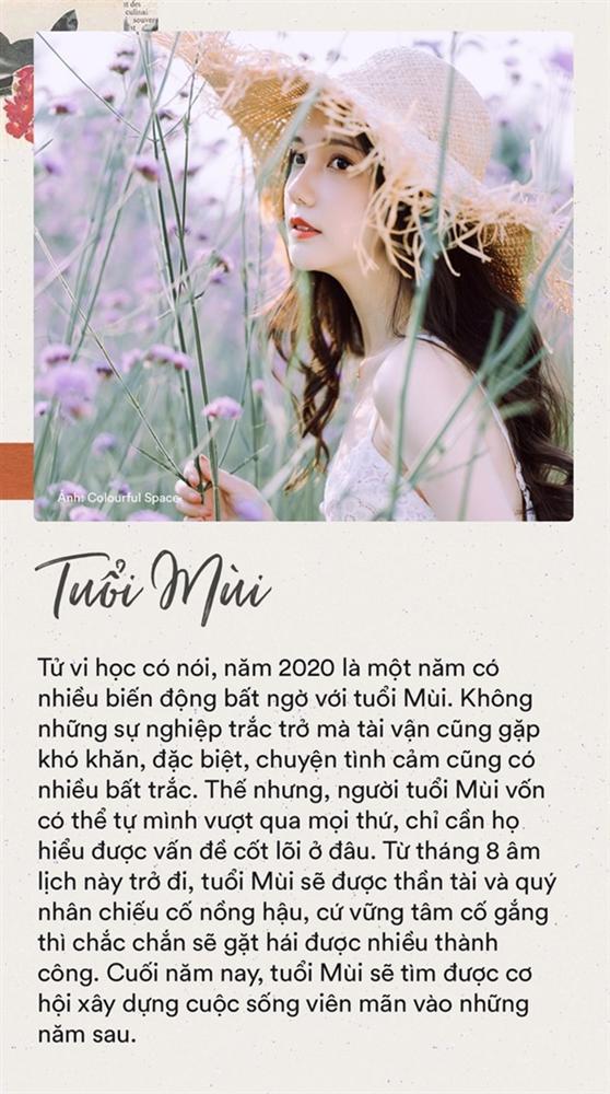 Tử vi học có nói, năm 2020 là một năm có nhiều biến động bất ngờ với tuổi Mùi. Không những sự nghiệp trắc trở mà tài vận cũng gặp khó khăn, đặc biệt, chuyện tình cảm cũng có nhiều bất trắc. Thế nhưng, người tuổi Mùi vốn có thể tự mình vượt qua mọi thứ, chỉ cần họ hiểu được vấn đề cốt lõi ở đâu. Từ tháng 8 âm lịch này trở đi, tuổi Mùi sẽ được thần tài và quý nhân chiếu cố nồng hậu, cứ vững tâm cố gắng thì chắc chắn sẽ gặt hái được nhiều thành công. Cuối năm nay, tuổi Mùi sẽ tìm được cơ hội xây dựng cuộc sống viên mãn vào những năm sau.