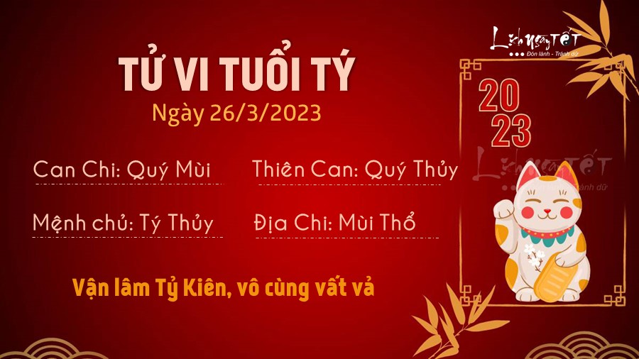 Tiếp nối tử vi ngày 25/3/2023, sự nghiệp của Tý hôm nay gặp Tỷ Kiên nên vô cùng vất vả, bạn phải chật vật trong hàng loạt công việc còn tồn đọng. Đường tiền bạc lung lay vì lâm Tương Hại. Tý cẩn thận trong vấn đề giấy tờ, sổ sách, quyết toán và sao kê nhé kẻo mất tiền như chơi. Những ai đang muốn đầu tư làm ăn nên chờ đến ngày khác, hôm nay mà đầu tư là thua lỗ khá nhiều.