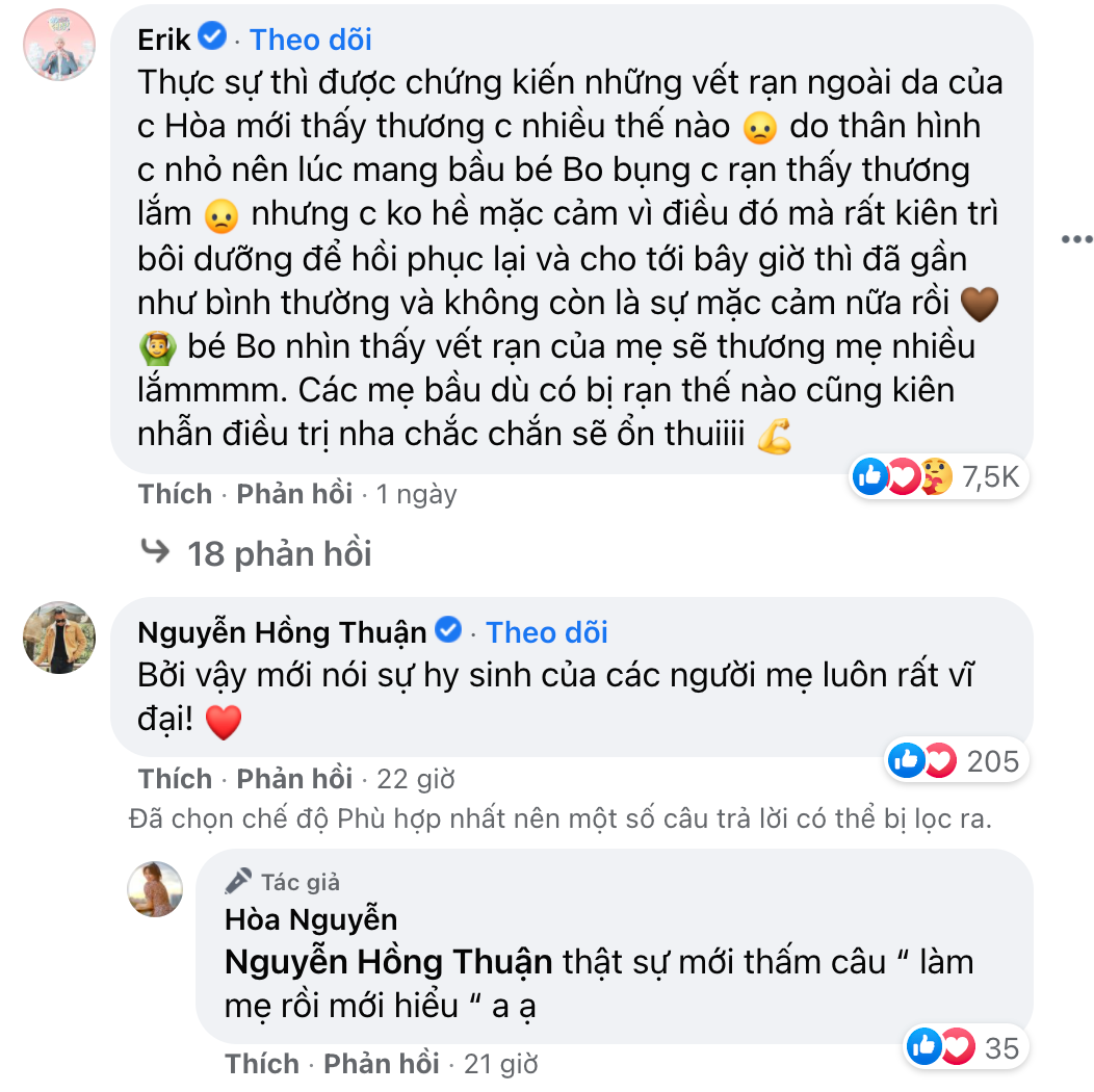 Dưới phần bình luận, rất nhiều mẹ bầu lần đầu chia sẻ hình ảnh chiếc bụng rạn chằng chịt của mình. Xấu hổ có, buồn bã có, tự ti có nhưng trên tất cả là tình yêu thương dành cho con, vì con mà mẹ có thể làm mọi việc. Nhiều mẹ bỉm gửi lời cảm ơn đến Hòa Minzy vì giúp họ cảm thấy trân trọng và tự tin hơn với những khuyết điểm trên cơ thể của mình.