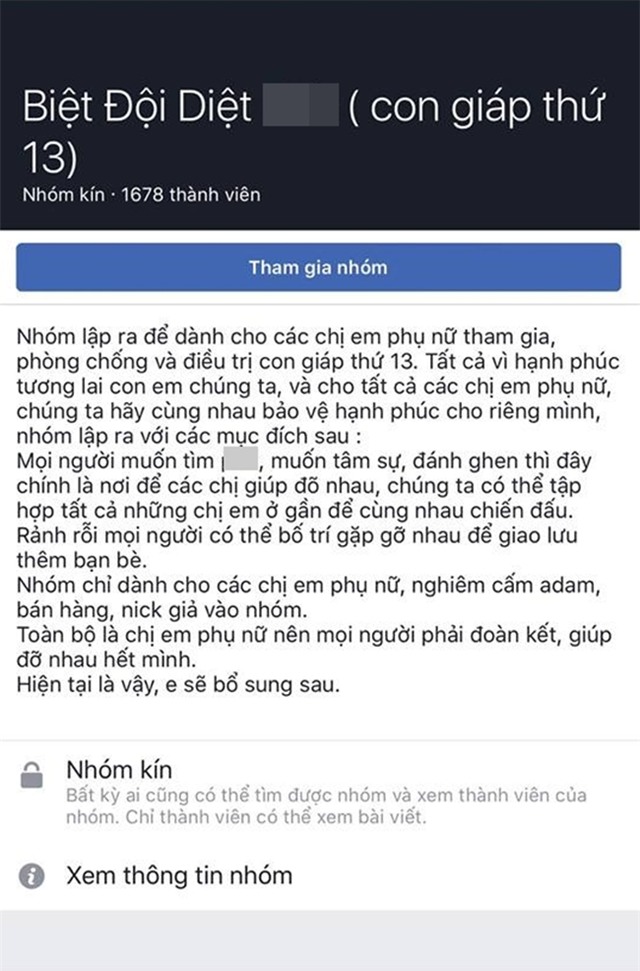 Cùng thời điểm với vụ đánh ghen kinh hoàng nói trên, cư dân mạng cũng đặt ra nhiều câu hỏi về một nhóm trên Facebook, được lập nên với cái tên "Biệt đội diệt con giáp thứ 13", gồm những người vợ còn khá trẻ. Họ kết giao với nhau trên group, sau đó rủ nhau đi đánh ghen có tổ chức. Lời kêu gọi được viết ra như sau: "Chúng ta có thể tập hợp tất cả các chị em ở gần để cùng chiến đấu", và mỗi khi có phi vụ đánh ghen, chị em lại hợp sức kéo nhau đi đánh ghen "hộ". Sau mỗi phi vụ, đánh xong người cần đánh thì topic lại được xoá đi.