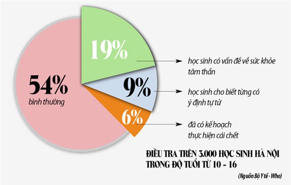 Các trường hợp học sinh “bỗng dưng” tự tử gây sốc nhưng không mới. Thông tin về kết quả thực hiện y tế trường học giai đoạn 2011 – 2015, Cục Y tế dự phòng (Bộ Y tế) cho biết, số học sinh có ý định tự tử cả nước ngày càng tăng cao (16,9%), trong đó 21,8% học sinh phải đến điều trị tại bệnh viện. Một số liệu điều tra khác với mẫu nhỏ hơn của Bộ Y tế, Tổ chức Unicef và WHO trên 3.000 học sinh Hà Nội trong độ tuổi từ 10 - 16 cũng chỉ ra rằng, có trên 19% học sinh có vấn đề về sức khỏe tâm thần, 9% học sinh cho biết từng có ý định tự tử và 6% đã có kế hoạch thực hiện cái chết.
