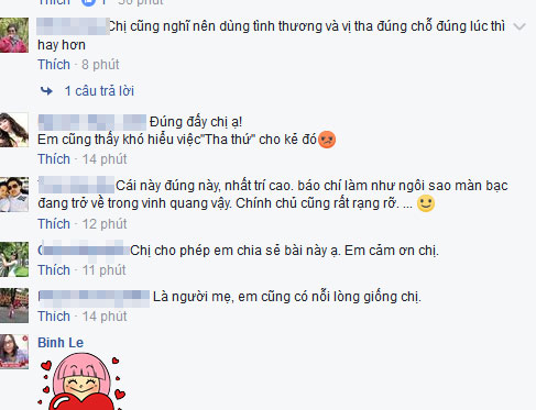 Và vì những em bé khác, mẹ cũng mong tất cả mọi người hãy chỉ nên tha thứ khi người có tội đã ăn năn đủ để tha thứ, cũng đừng vì một lợi ích nhỏ nào đó mà bất chấp tất cả, bởi như nhà văn La Mã Publilius Syrus từng nói: "Người dung thứ cho cái ác làm tổn thương cái thiện!".