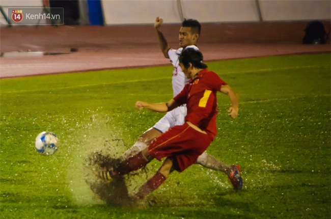 Mặt sân ngập trong nước khiến lối chơi ban bật, kỹ thuật của U22 Việt Nam bị ảnh hưởng rất nhiều. Ngay phút thứ 5, nếu vũng nước trước khung thành thủ môn Tiến Dụng không chặn trái bóng lại, lưới của U22 Việt Nam đã bị rung lên.