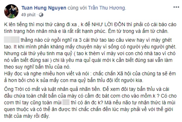 Trong khi dân tình đang xôn xao về vụ việc này thì Tuấn Hưng đã nhanh chóng phủ nhận trên trang cá nhân. Không những vậy, nam ca sĩ còn khá nặng lời đáp trả lại người đã tung tin đồn sai sự thật, gây hoang mang về gia đình mình.