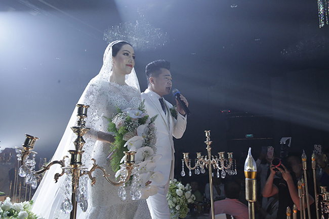 Cô dâu Huỳnh Tiên nở nụ cười hạnh phúc khi được ông xã nắm tay tiến lên lễ đài.