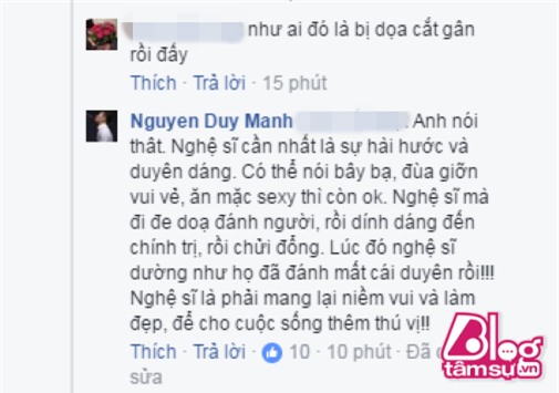 Người hâm mộ vô cùng thích thú với hình ảnh ông bố đảm đang của Duy Mạnh. Tuy nhiên, trước 1 bình luận ác ý về con trai nhạc sĩ Hải Phòng, 1 fan đã nhắc nhở người này hãy cẩn thận lời nói, ” như ai đó là bị dọa cắt gân rồi đấy“. Dòng comment đầy ẩn ý, nhắc khéo đến vụ ồn ào trước đây của nam ca sĩ Tuấn Hưng khi có người nói xấu bé Su Hào trên Facebook. Ngay lập tức, Duy Mạnh đã bày tỏ suy nghĩ cá nhân về hành động “dọa cắt gân” của “ai đó”: “Anh nói thật, Nghệ sĩ cần nhất là sự hài hước và duyên dáng. Có thể nói bậy bạ, đùa giỡn vui vẻ, ăn mặc sexy thì còn ok. Nghệ sĩ mà đi đe dọa đánh người, rồi chửi đổng. Lúc đó nghệ sĩ dường như họ đã đánh mất cái duyên rồi!!! Nghệ sĩ là phải mang lại niềm vui và làm đẹp, để cho cuộc sống thêm thú vị!!“”