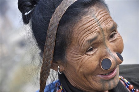 Phụ nữ của một bộ lạc trên cao nguyên Apatani của Ấn Độ nổi tiếng vì đeo những chiếc khuyên hai bên mũi từ khi còn trẻ đến lúc qua đời. Phong tục này là một cách để các cô gái tự làm xấu mình đi.