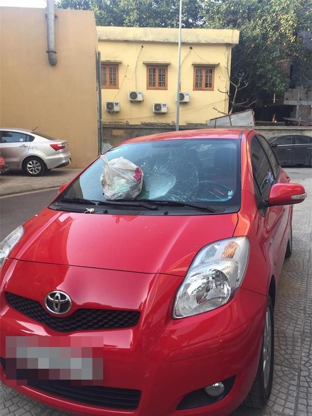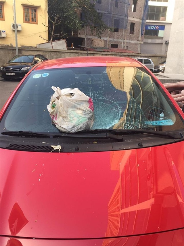 "Xe em đỗ ở sân chung cư bị vứt rác xuống vỡ hết kính xe. Về khu chung cư CT14 B.H này ở được 4 tháng thì đã 2 lần xe em ăn rác ở trên cao vứt thả xuống. Lần đầu là một túi đầy cơm thiu mì thối đầy xe, phải mang đi rửa hết 100k mới sạch. Lần dính chưởng này thì kính xe nát tươm, vụn kính bắn vào bên trong xe, bây giờ chỉ có nước gọi cứu hộ.