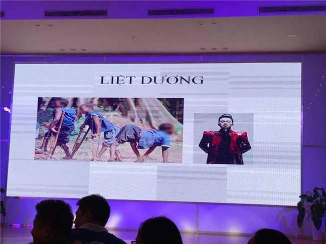 nhóm người bị bại liệt chân tay, một bên là nam ca sĩ Tùng Dương. Đáng