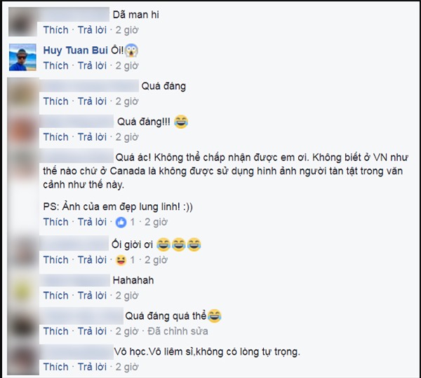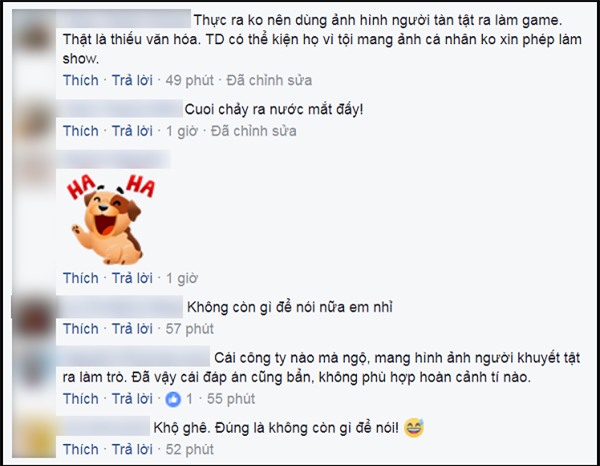 "Cái công ty nào mà ngộ, mang hình ảnh người khuyết tật ra làm trò. Đã vậy cái đáp án cũng bẩn, không phù hợp hoàn cảnh tí nào", thêm một bình luận phê bình khác.