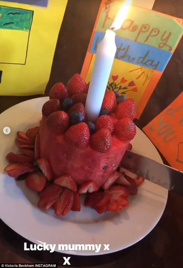Dịp sinh nhật tuổi 44 của cô mới đây, Victoria đã chia sẻ những món quá giản dị nhưng vô cùng ngọt ngào và chu đáo của chồng con. Biết bà Becks đang giữ dáng, nên họ đã tặng cho cô một chiếc bánh sinh nhật bằng trái cây. Vic hạnh phúc chia sẻ trên mạng: "Họ rành tôi quá mà! Chiếc bánh sinh nhật bằng trái cây để tôi dùng điểm tâm. Quả là một bà mẹ may mắn".