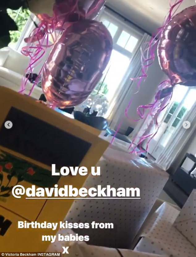 "Những nụ hôn sinh nhật từ các con yêu của tôi. Yêu anh, @davidbeckham", Victoria hạnh phúc ghi khi nhìn thấy những món quà và trái bóng bay xinh xắn.