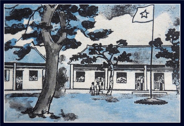 Trường mới xây trên nền ngôi trường lợp lá cũ. Nhìn từ xa, những mảng tường vàng, ngói đỏ như những cánh hoa lấp ló trong cây.
