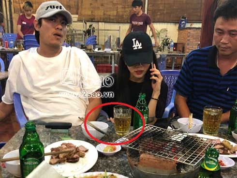 Trong một bức ảnh chụp chung, An Nguy một tay cầm điện thoại, tay còn lại bị soi... đặt trên đùi của nam diễn viên họ Kiều.