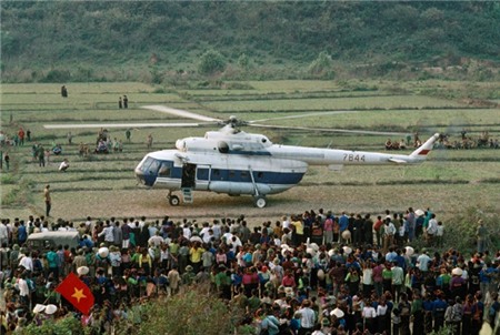 | Trực thăng trở Đại tướng Võ Nguyên Giáp tới chiến trường xưa nhân dịp kỷ niệm 40 chiến thắng Điện Biên Phủ (1954 - 1994). 40 năm sau chiến thắng Điện Biên Phủ, người chỉ huy năm xưa trở lại thăm nơi quân và dân ta đã cùng nhau chiến đấu và chiến thắng quân Pháp ngày 7/5/1954. Ảnh: Catherine Karnow. |